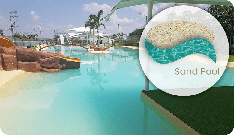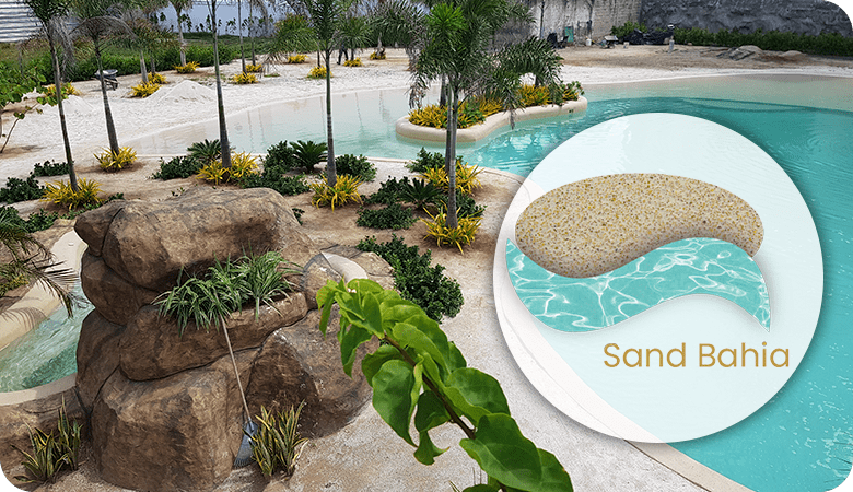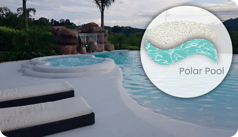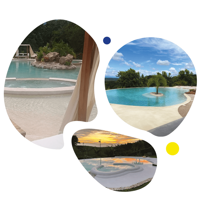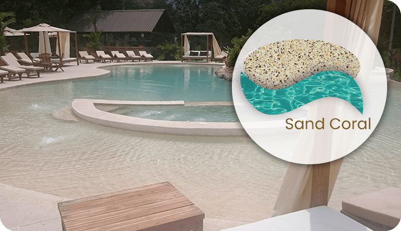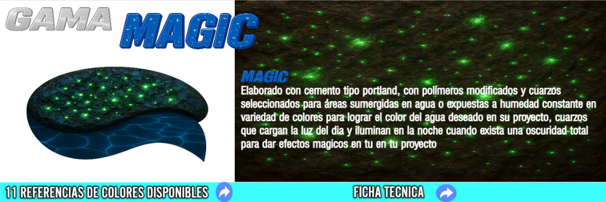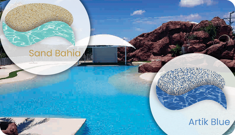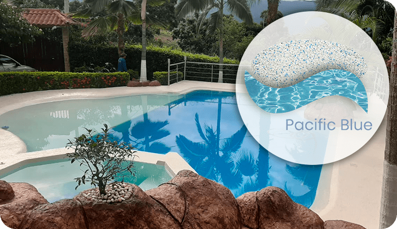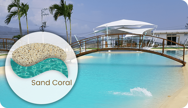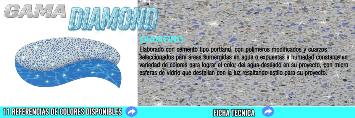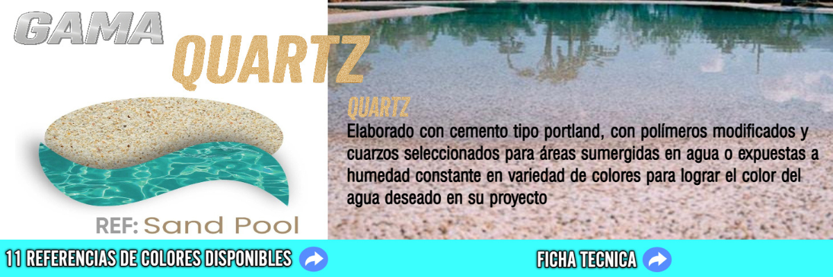 de acabado continuo para piscinas, sistema arena o tradicionales, espejos de agua, fuentes y áreas sumergidas en agua.Elaborado con cemento tipo Portland, con polímeros modificados y quarzos seleccionados en variedad de colores para lograr el color del agua deseado en su proyecto.